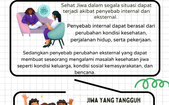 Sri Nowo Retno menjelaskan bahwa penyebab gangguan kesehatan jiwa dapat berasal dari faktor internal, seperti perubahan kondisi kesehatan, perjalanan hidup, dan tekanan pekerjaan, serta faktor eksternal, seperti kondisi keluarga, lingkungan sosial, hingga bencana.