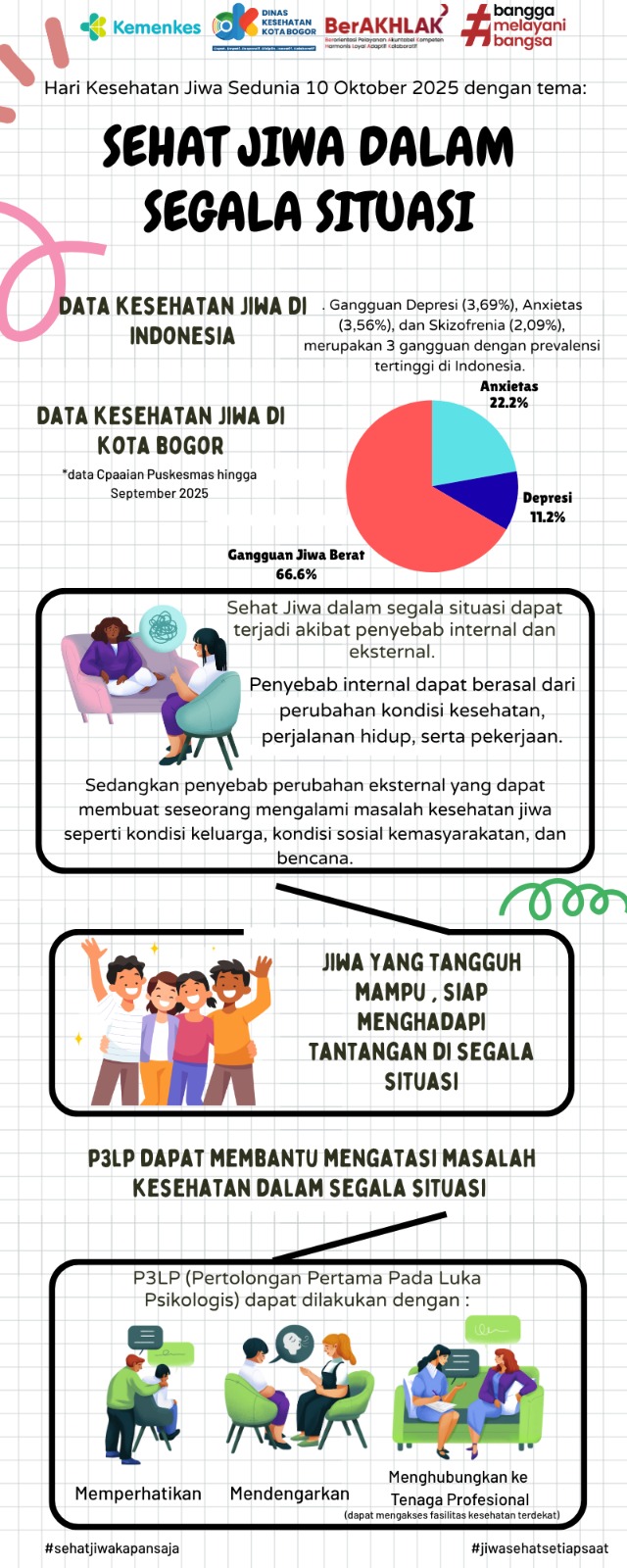 Dalam siklus kehidupan, masalah kesehatan jiwa dapat dialami siapa pun. Data menunjukkan bahwa 1,4% penduduk usia 15 tahun ke atas mengalami depresi. Sementara itu, di Kota Bogor, 22,2% penduduk mengalami kecemasan, 11,2% depresi, dan 66,6% mengalami gangguan jiwa berat, berdasarkan capaian pelayanan puskesmas hingga September 2025.