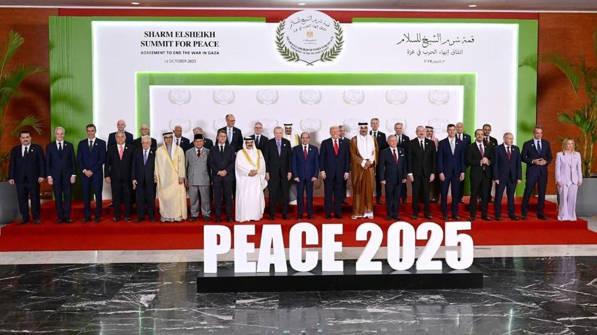 Sesi foto dilakukan di atas panggung berlatar belakang “Sharm El-Sheikh Peace 2025”. Dalam foto itu, Trump tampak mengenakan setelan jas biru gelap dan berdiri di tengah barisan depan. Di sisi kanannya berdiri Presiden Mesir Abdel Fattah El-Sisi, diikuti Presiden Turki Recep Tayyip Erdogan dan Emir Qatar Syekh Tamim bin Hamad Al Thani.