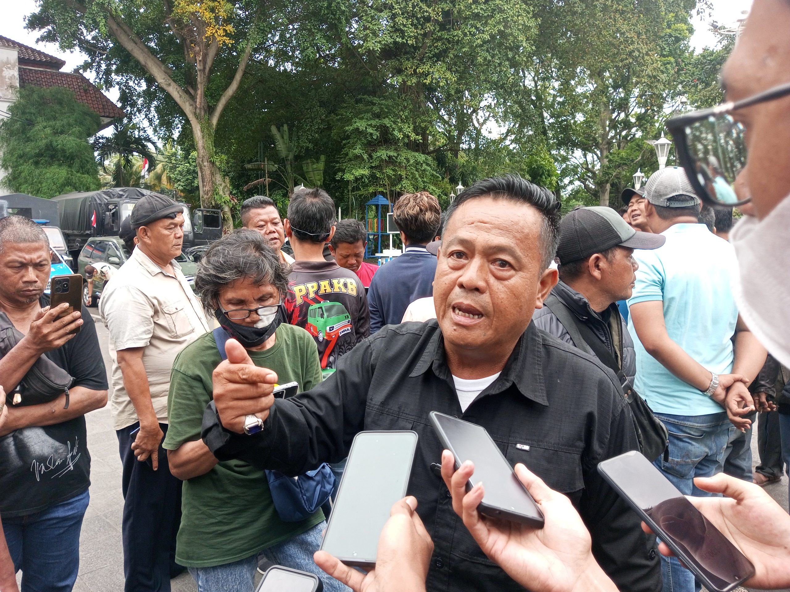 “Mobil yang dikandangin itu kan sudah ada puluhan, ditangkap begitu saja. Walaupun ada juga begitu ditangkap dikasih surat hilangnya di dinas, di kantor. Itu kan menyalahi aturan, seperti itu. Dan kami tadi protes di dalam,” tegasnya.