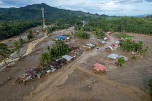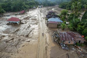 Sisa material lumpur dari terjangan banjir masih menghampar di kawasan tersebut.