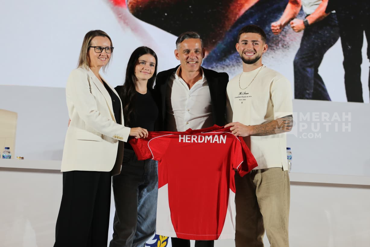 Suasana semakin akrab ketika Herdman mengajak sang istri serta kedua anaknya naik ke atas panggung usai konferensi pers. Mereka berfoto bersama sambil membentangkan jersey Timnas Indonesia bertuliskan nama “Herdman” di bagian punggung, disambut senyum dan tepuk tangan hadirin.