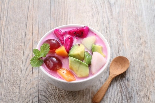 • Buah-buahan segar seperti melon, pepaya, alpukat, buah naga, pir, anggur, dan kelapa muda, dipotong dadu.