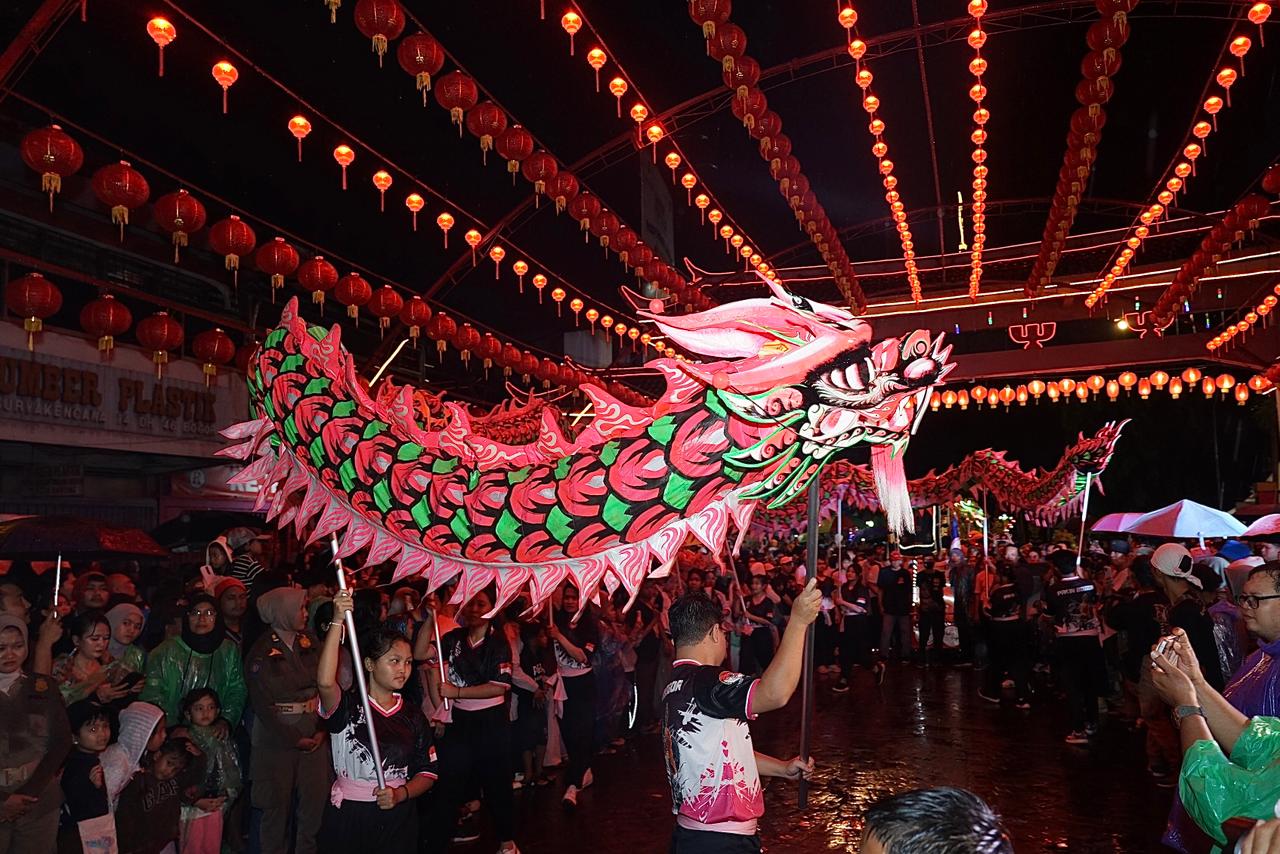 Kemeriahan dimulai dengan prosesi khidmat dari Paskibraka (PPI) Kota Bogor yang membawa Bendera Merah Putih, disusul oleh ikon utama malam itu: Liong Merah Putih sepanjang 50 meter. Uniknya, gerak lincah naga raksasa ini diiringi oleh tabuhan musik dari Tim Qasidah, menciptakan harmoni akulturasi yang jarang ditemui di tempat lain. Tak ketinggalan, 12 tim barongsai, komunitas Lengser Ambu Bogor, hingga kelompok marawis turut ambil bagian dalam parade panjang tersebut.